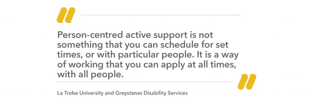 La Trobe University and Greystanes Disability Services describe person-centred Active Support as a way of working that enables everyone, no matter what their level of intellectual or physical disability, to make choices and participate in meaningful activities and social relationships.