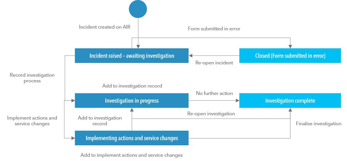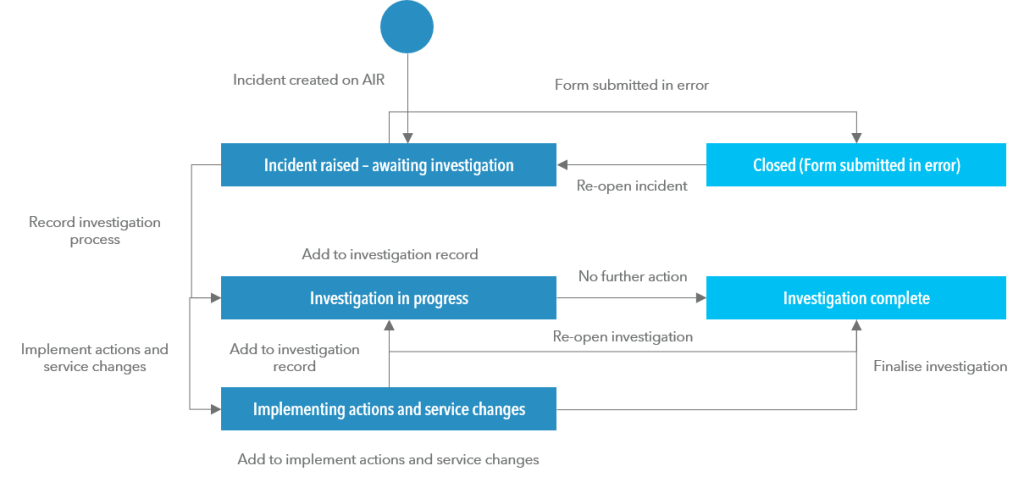 When an incident report is submitted using AIR, the appropriate service manager or team leader will receive an email that a new report has been created. The General Manager and the Senior Quality and Safe Guards Advisor (disability services) will also receive an email.